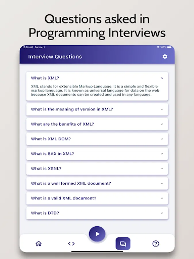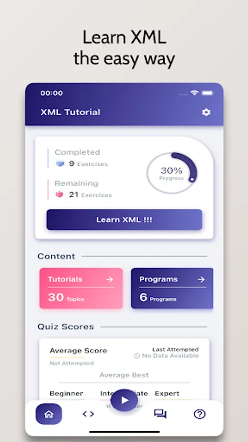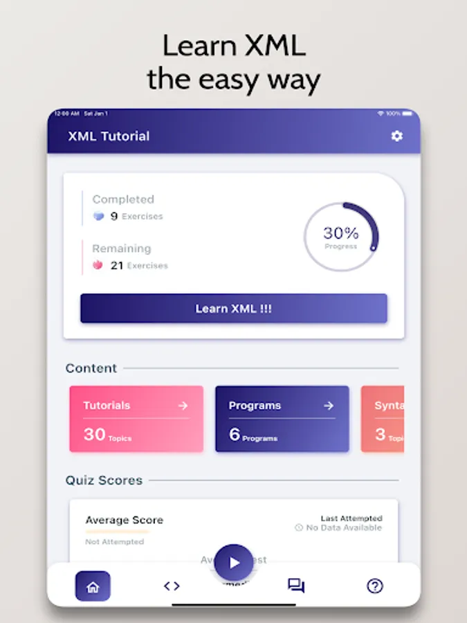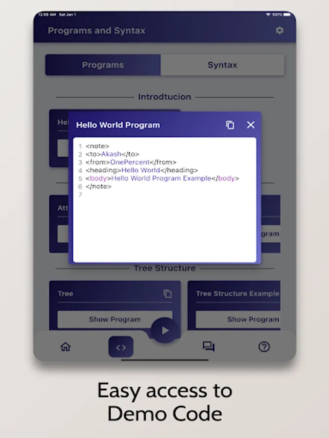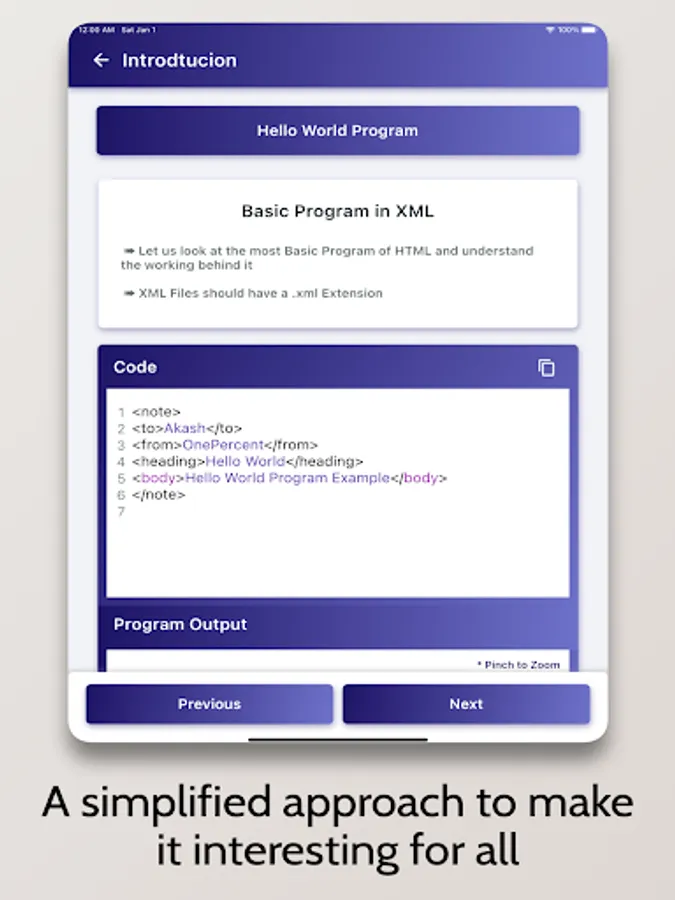 Whether you want to learn XML Programming as a Hobby, for School/College, or want to build a Career in the field, this Tutorial is for you. The tutorial covers everything from the Basics of Programming to Advanced Concepts. It also comes with a sleek and interactive graphical user interface.