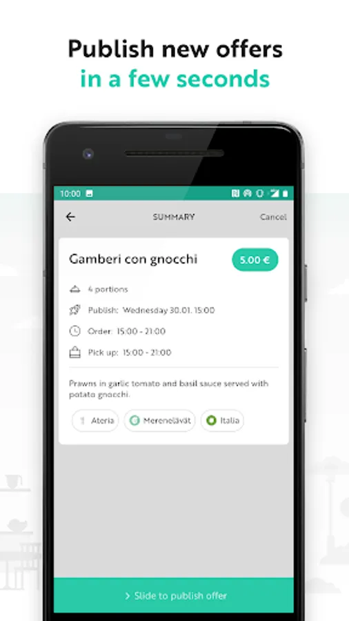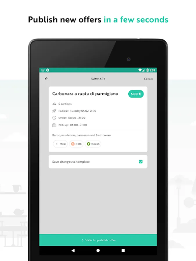 When closing your lunch or evening service for the day, you will do two things. First, you take a look at what's left over and calculate how many portions you can make out of it. Then, you publish these portions on our platform using our ResQ Partner app for Android.