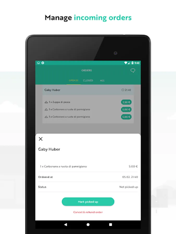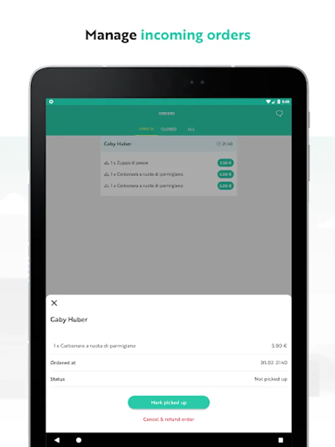 Customers can come in and pick up their orders within the pickup time window you have defined. All you need to do is check the order receipt, hand out the order to the customer and mark the order as picked up in your app.