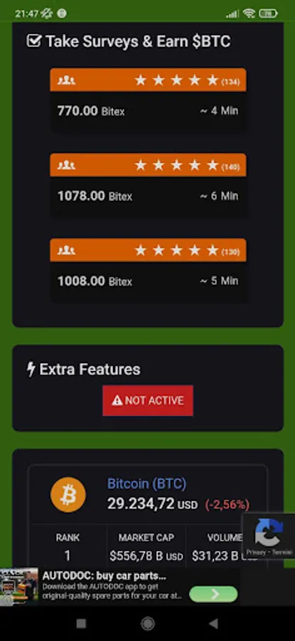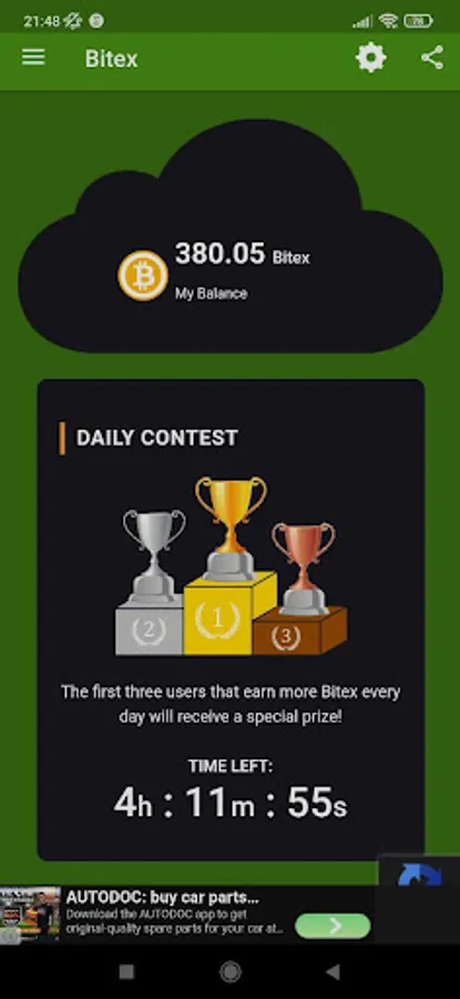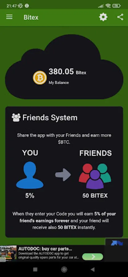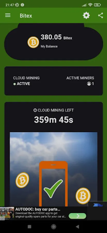 This app allows you to mine $BTC cryptocurrency directly in the cloud from your smartphone without consuming energy.