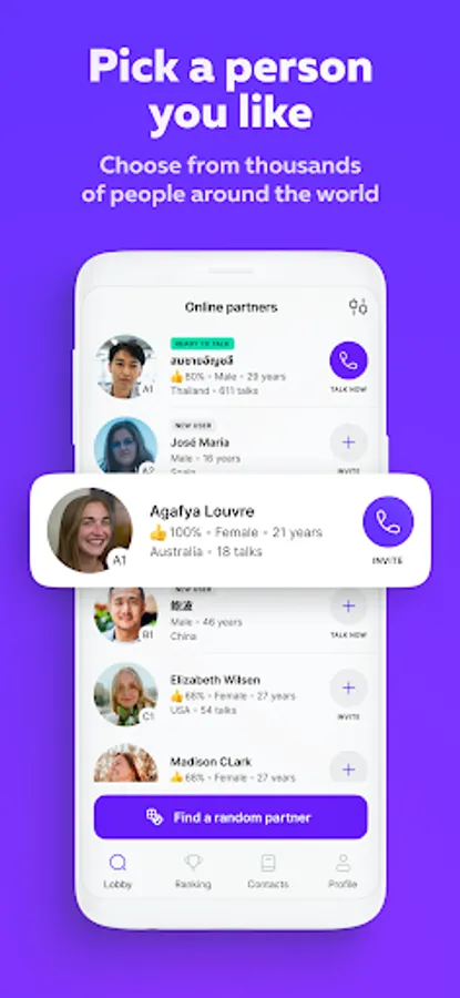Thousands of users worldwide have already improved their speaking skills by talking with each other. You learn to talk about yourself, your work or anything else that interests you and your partner. Start speaking English and find new friends today!