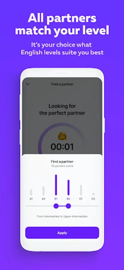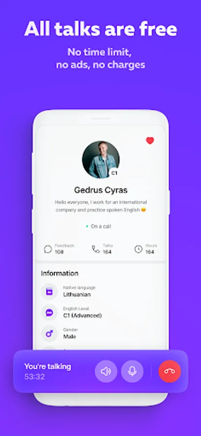 Say goodbye to your fear of talking in English or making mistakes. This application will connect you with friendly people who will support you even if you are at the very beginning of your learning journey. You don't need to worry about forgetting irregular verbs or not being able to remember the right word. With practice and speaking training comes greater confidence and the ability to express yourself no matter what language level you are at.