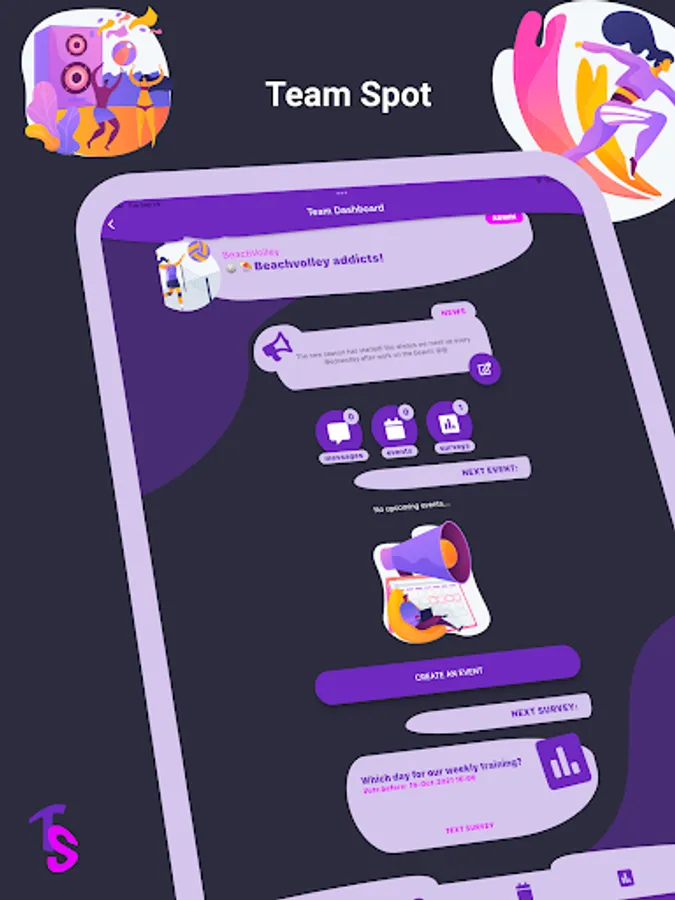 TeamSpot is a beautiful sport groups management app. Join a team and do not miss any event or news ! Team Spot offers all the tools to keep players informed, organize games and practices, launch surveys and stay up to date with everybody availability !