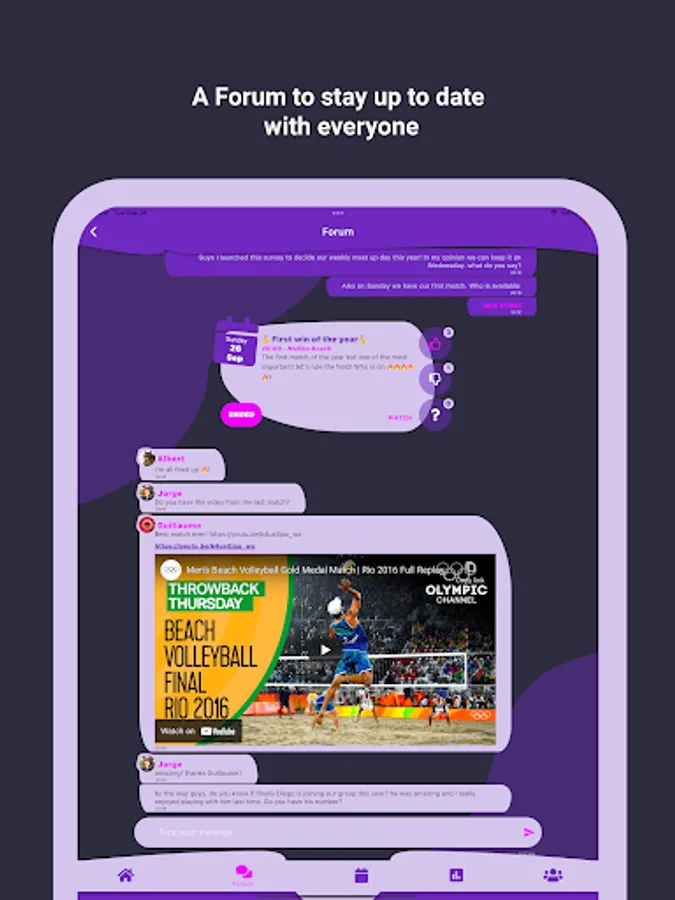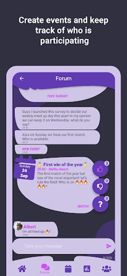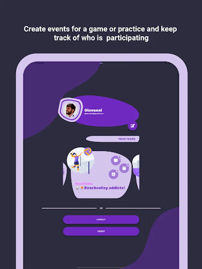 - Plan games, practices or any other event and keep track of who is participating: the “events” tab allows to create an event as well as weekly or monthly activities. Being it a weekly training session or a single game every team player will be able to quickly tell their availability to everybody else!