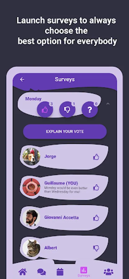 - Launch surveys to always choose the best option for everybody: The “surveys” tab allows you to create simple surveys to choose among up to 5 options! Being it a date to block, a place to choose or the next training course. This is the perfect tool to always choose the best option for everybody.