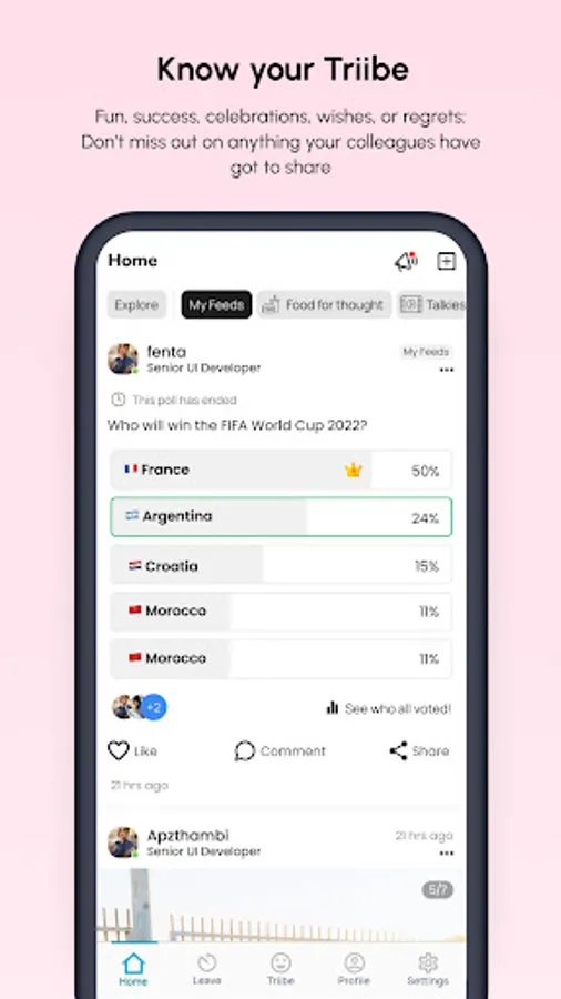 Unleash the power of connection and collaboration with Triibe. Triibe app is your one-stop-shop for building a culture of connection, engagement,recognition, and collaboration within your organization. With features like News Feed, Employee Directory, Polls, and much more, you'll never miss a beat. Building a culture that lasts is now easier than ever.