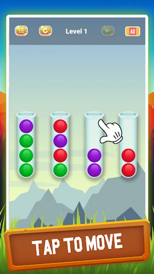 🌟 If you are playing for the first time, you will find yourself in front of the entry level. Before you will be several flasks filled with a different number of bubbles. Take one of the overs by simply pressing it with your finger. While holding touch, drag the ball to another container. It will be on top and you will have access to the rest of the bubbles in the vial. As soon as you completely dismantle all the balls, the level will be completed and you can go further.