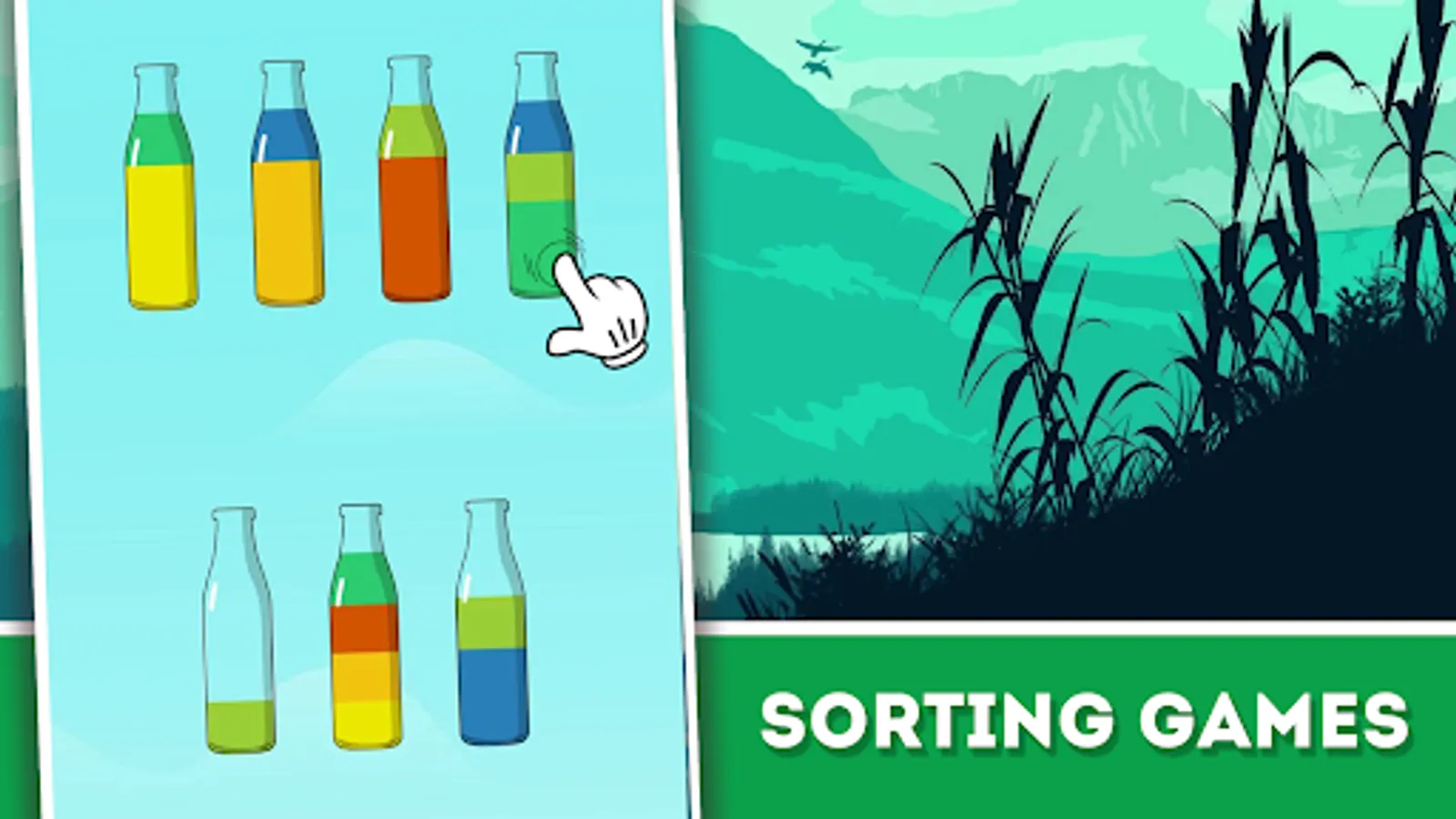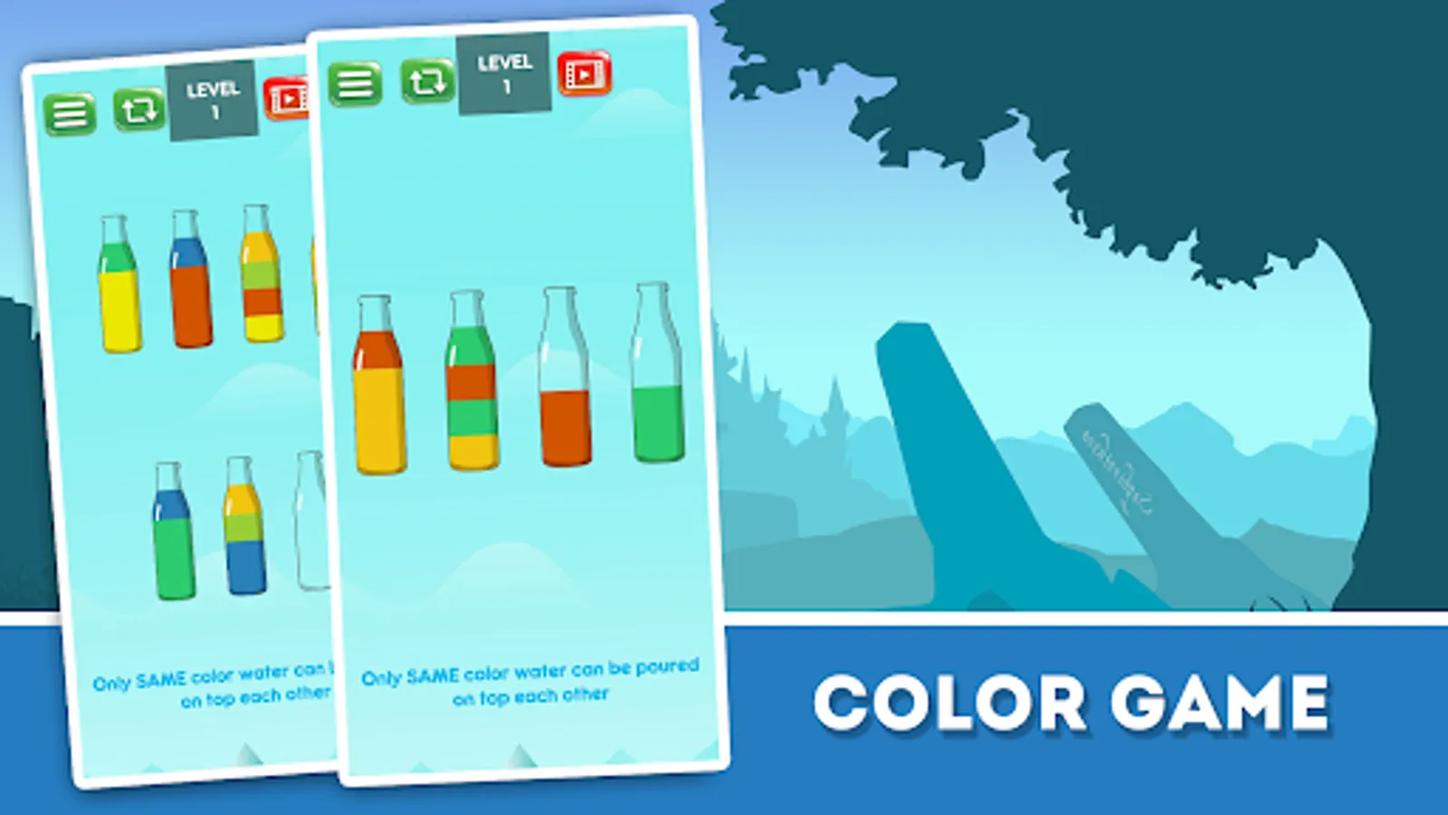 In the Tricky Water Sort Puzzle you have to pour water from one bottle to another until you sort water puzzle by color. Click on the bottles to pour water.