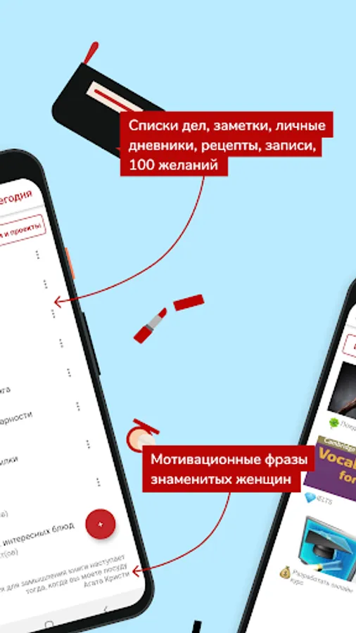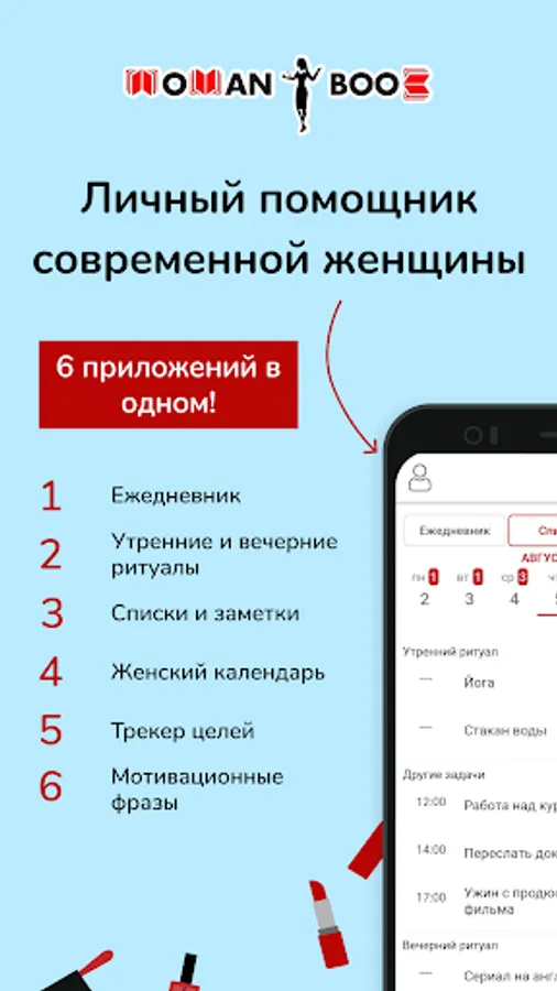Womanbook is a woman's personal assistant. Management of work, household and personal affairs - on one phone screen. The first planner app designed with the interests and needs of the modern woman in mind. Thanks to the lightweight, well-thought-out interface of the application, you will organically introduce the desired good habits into your life and get life in a balance in ten areas.