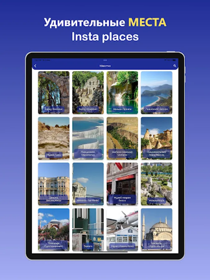 Чудеса природы в Турции: Босфор, Мраморное море, Эгейское море, Средиземное море, Черное море, Памуккале, каньон Ихлара, озеро Салда, озеро Ван, озеро Туз, озеро Эгридир, Каппадокия, лавандовые поля, хлопковые поля, чайные плантации, гора Арарат.