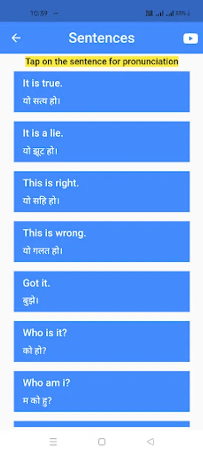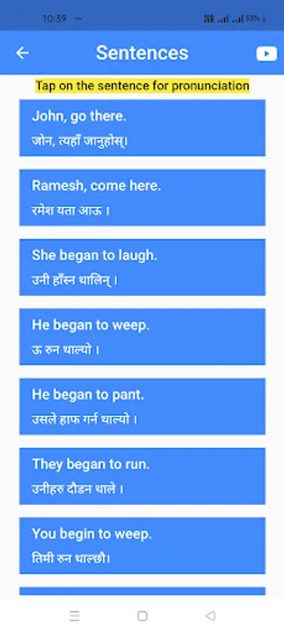 Our app boasts a vast collection of 1000+ English sentences commonly used in daily conversations. Each sentence is accompanied by its corresponding Nepali meaning, providing you with a comprehensive understanding of its usage. Whether you're a beginner or an advanced learner, you'll find sentences suited to your proficiency level.
