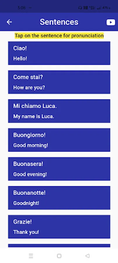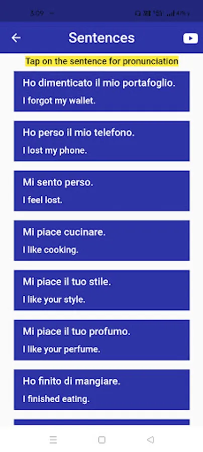 1. Extensive Sentence Database: Our app boasts a vast collection of Italian sentences covering various topics, including travel, food, business, education, and more. With over 600+ sentences, you'll have a comprehensive resource at your fingertips.