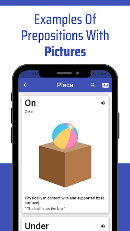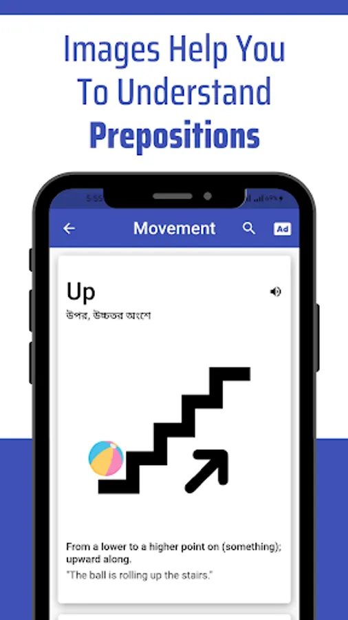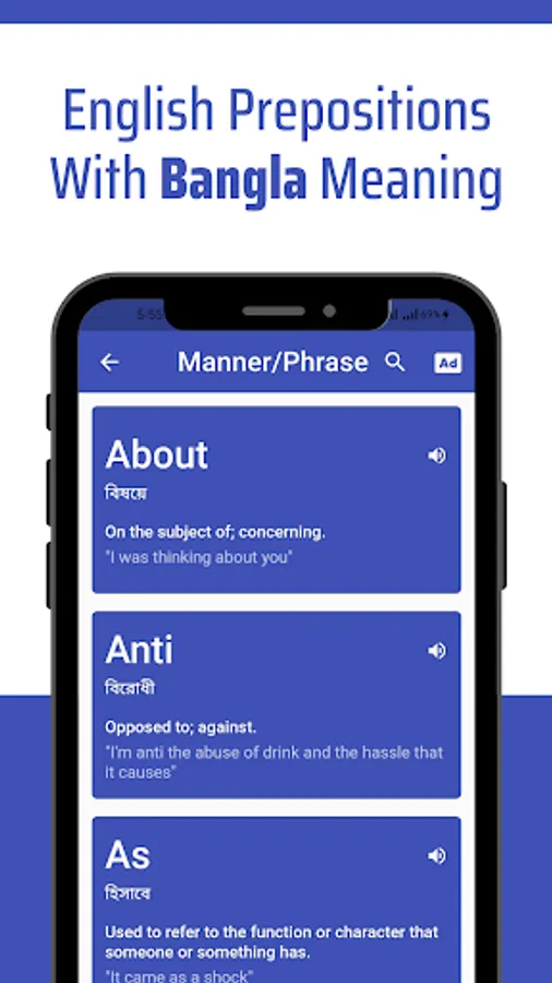 Clueval presents Prepositions Bangla. This app is a fully dedicated to learning English prepositions With Bangla Meaning. In this app you can explore useful 150+ prepositions with pictures example & sentence in Bangla. It is a full-fledged English preposition dictionary for Bengali community. We have added all English prepositions in Bangla with examples.