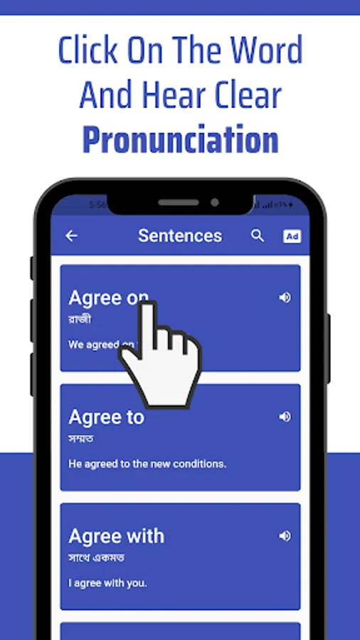 - Click on the word and hear clear pronunciation of each word and sentence.