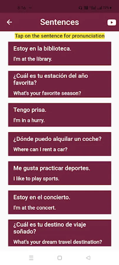 With over 500+ pre-loaded sentences, our app covers a wide range of everyday topics, ensuring that you have access to relevant and practical translations whenever you need them. From basic greetings and introductions to more complex expressions, our comprehensive sentence database will enable you to communicate effectively in both Spanish and English.