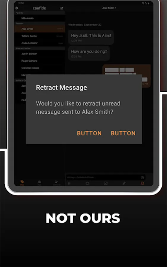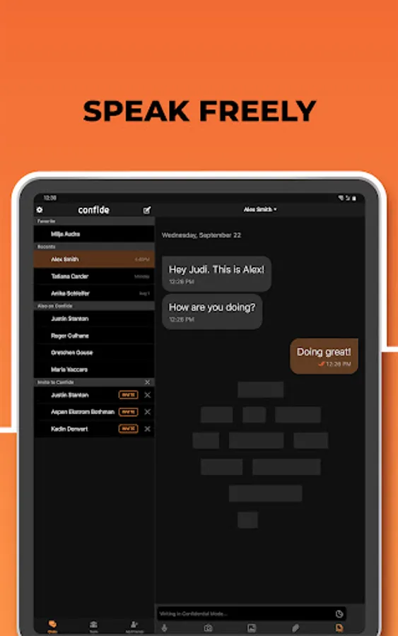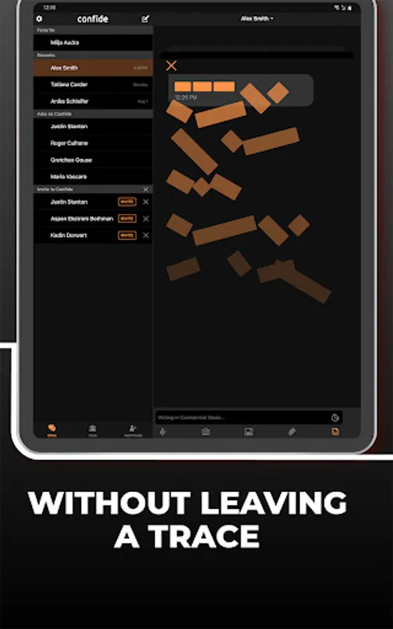Communicate privately with confidential messages and leave no digital trace with the Confide app. With encrypted messaging, anonymous chat, and anonymous texting – you can send, retract and hide secret text messages, whether they’re in a private chat or group chat.