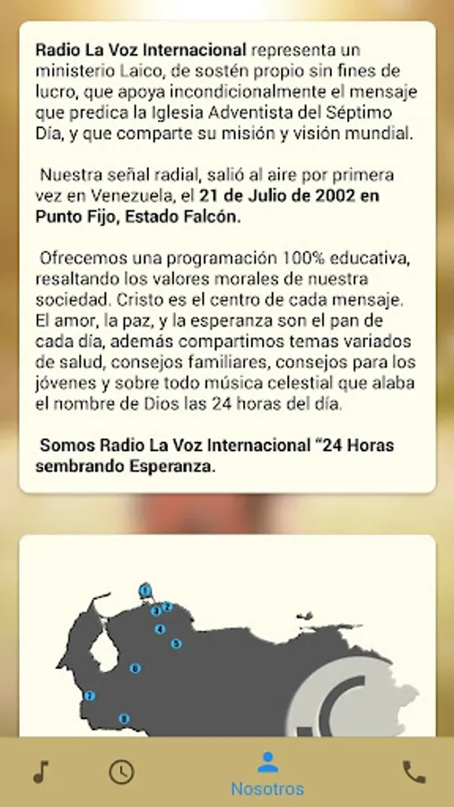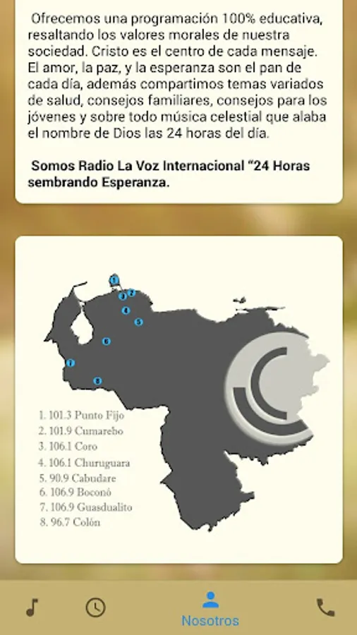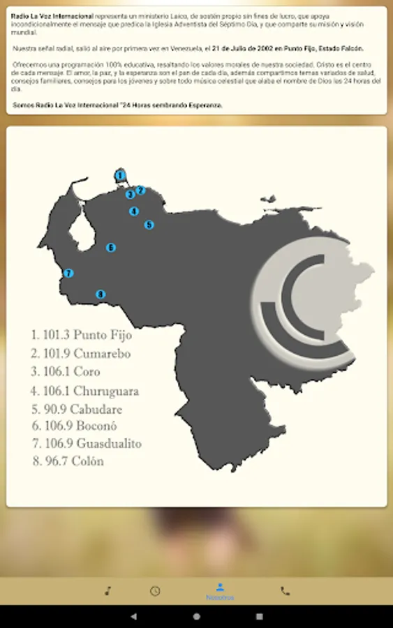 Radio La Voz International is a lay ministry, self-supporting non-profit. Our radio signal, aired for the first time in Venezuela, on July 21, 2002 in Punto Fijo, Falcon State.