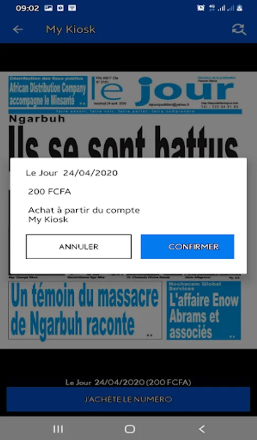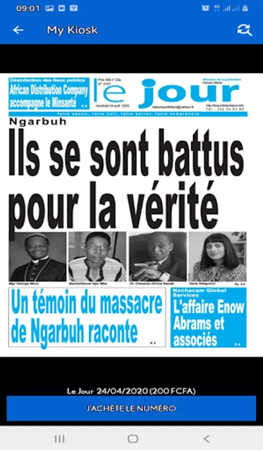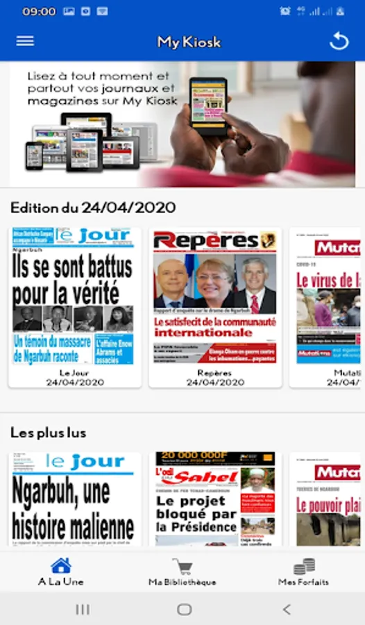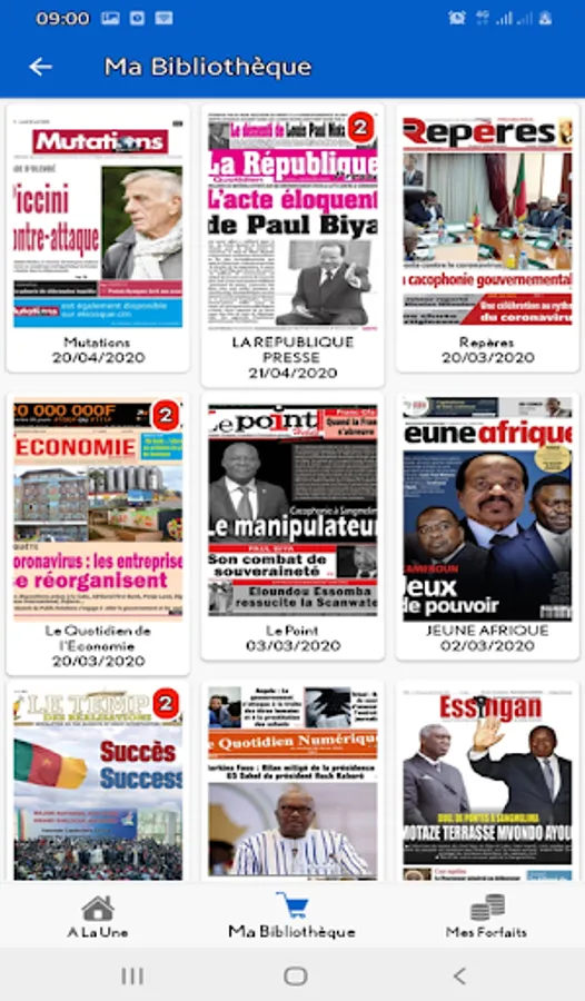 You have access to all the national press, the international press and the specialized press every day from 4 am. We offer you the exclusivity of all the major presses such as Cameroon tribune, Daily economy, Le jour, Mutations, InfoMatin, The Guardian Post, Jeune Afrique, Le Point Hebdo, EcoMatin, L'œil du Sahel, Le Soir , Weekly Educations, Echos Santé, Météo Sports and other People magazines.