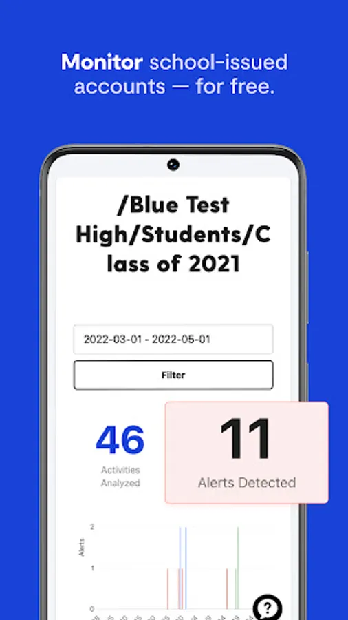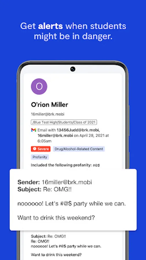 Bark for Schools is a free student and school safety product that detects potential issues across Google Workspace, Microsoft 365, and Chrome to help protect students online and in real life. Our award-winning monitoring tool scans emails, chats, and saved files for issues like bullying, online predators, sexual content, suicidal ideation, and more.