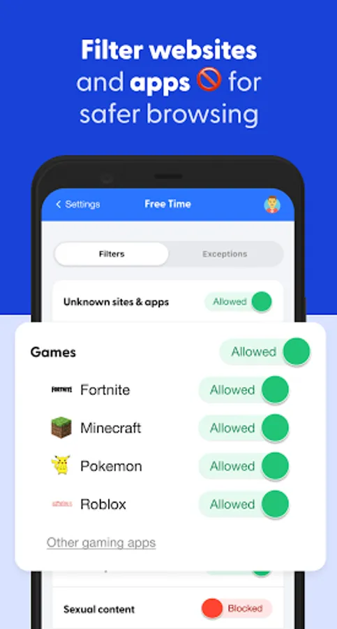 Our web filter lets you select which websites your child can access on their devices. You can allow or block specific sites — or even whole categories like streaming services, online gaming, sexual content, and more.
