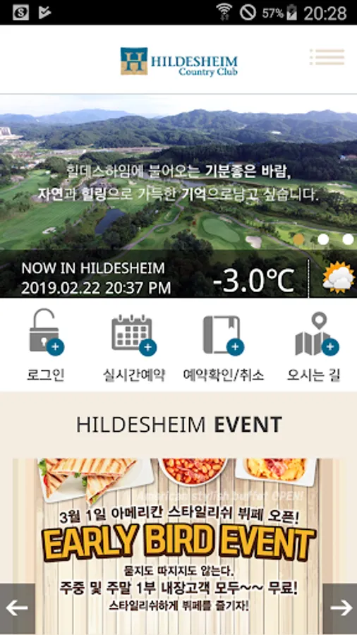 The clubhouse is conveniently located close to the main access roads and the fields, with a peaceful setting behind a lush green mountain.