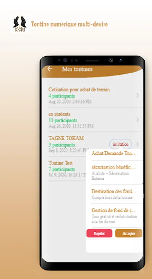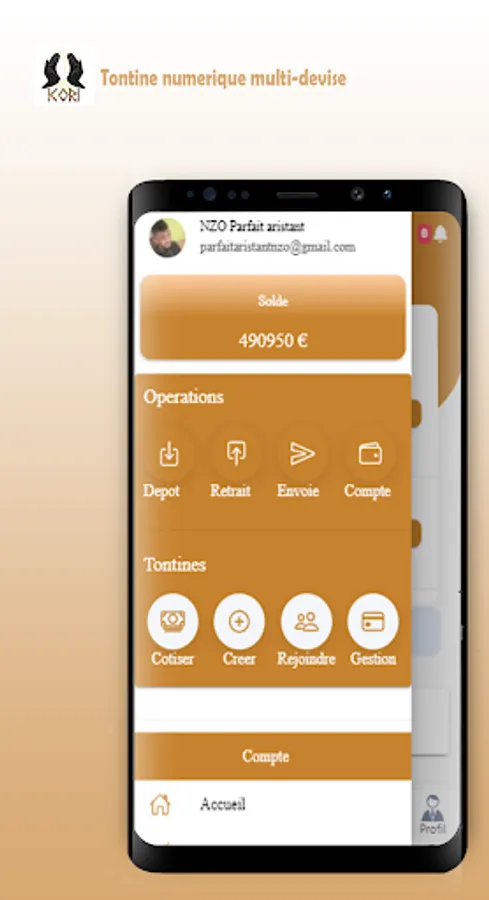 Kori is a platform allowing Internet users to enter tontines, contribute, eat money, sell money, pay for online services, chat with contacts ...