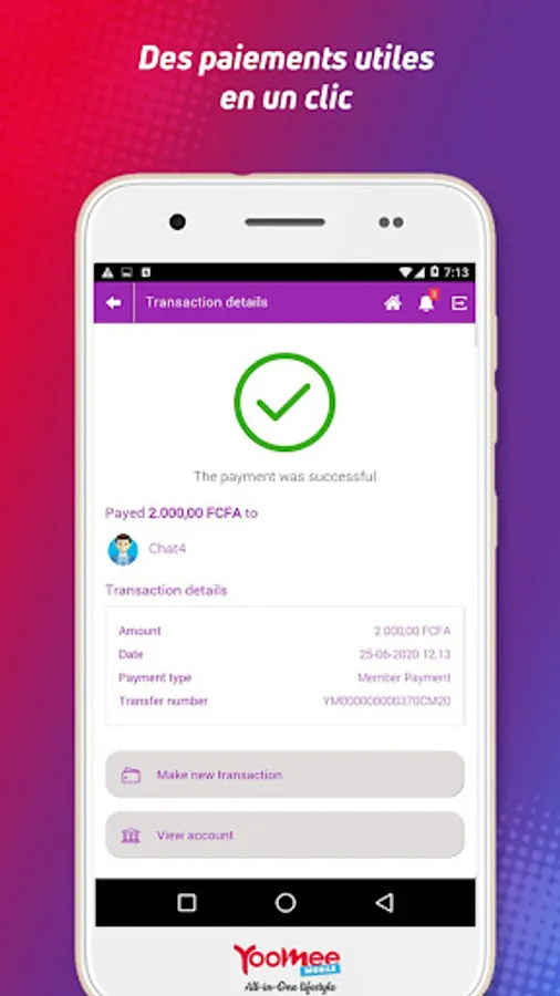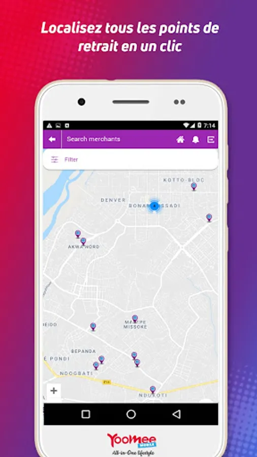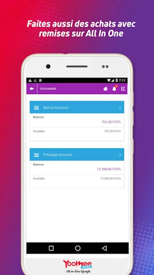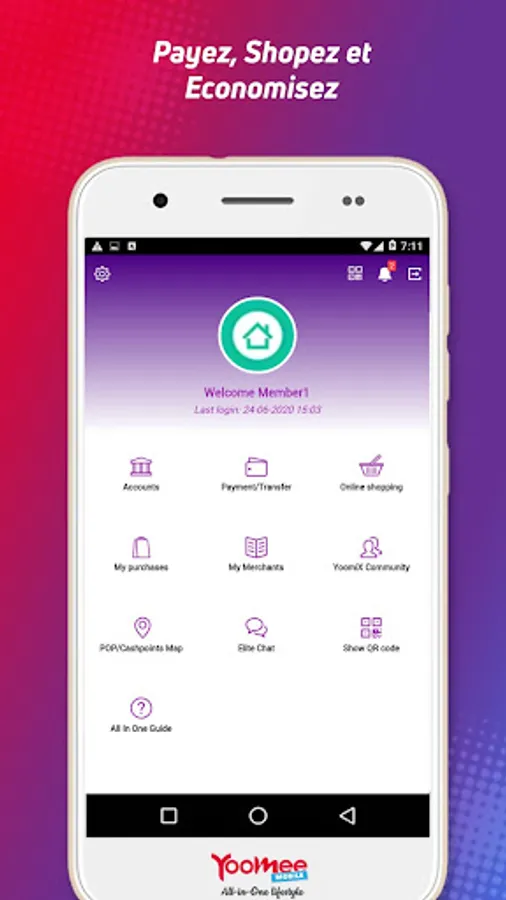 Discover All In One, the new all-in-one Android application from Yoomee Mobile that makes your life easier. From money transfer "Yoomee Money", flash payments with discount by QR Code in more than 3000 shops in Cameroon, All In One also allows you to make online purchases, pay bills, etc..