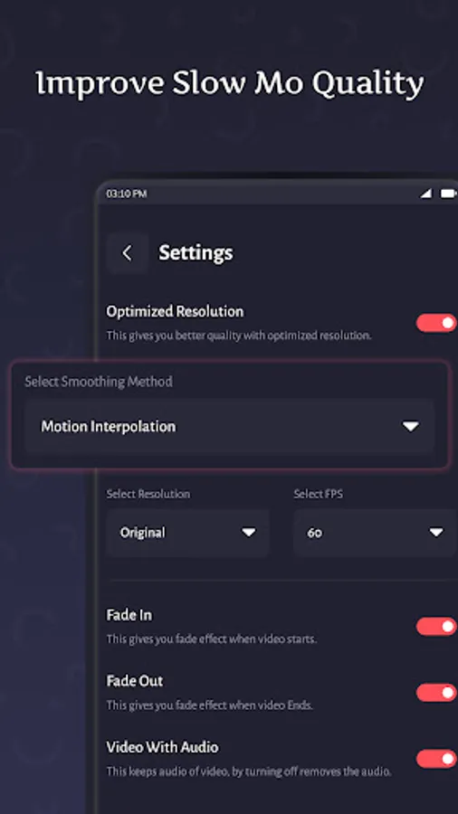 Click on record now or import video from the gallery to slow down video speed. The app gives cut, delete and trim features to shorten the video. Select the slowdown or fasten speed from the selective options. In setting, you can enable smooth and optimized resolution. You can select the smoothing method. Select the video resolution & FPS band. In slow motion video, you can add the fade IN and OUT effects. You can also turn the sound off of the video.
