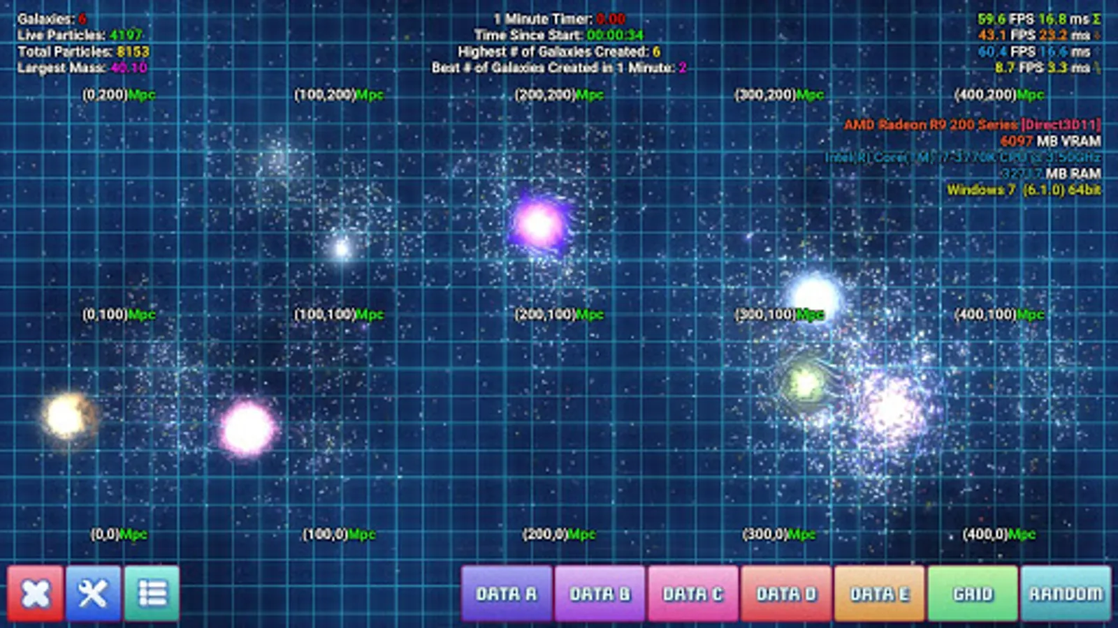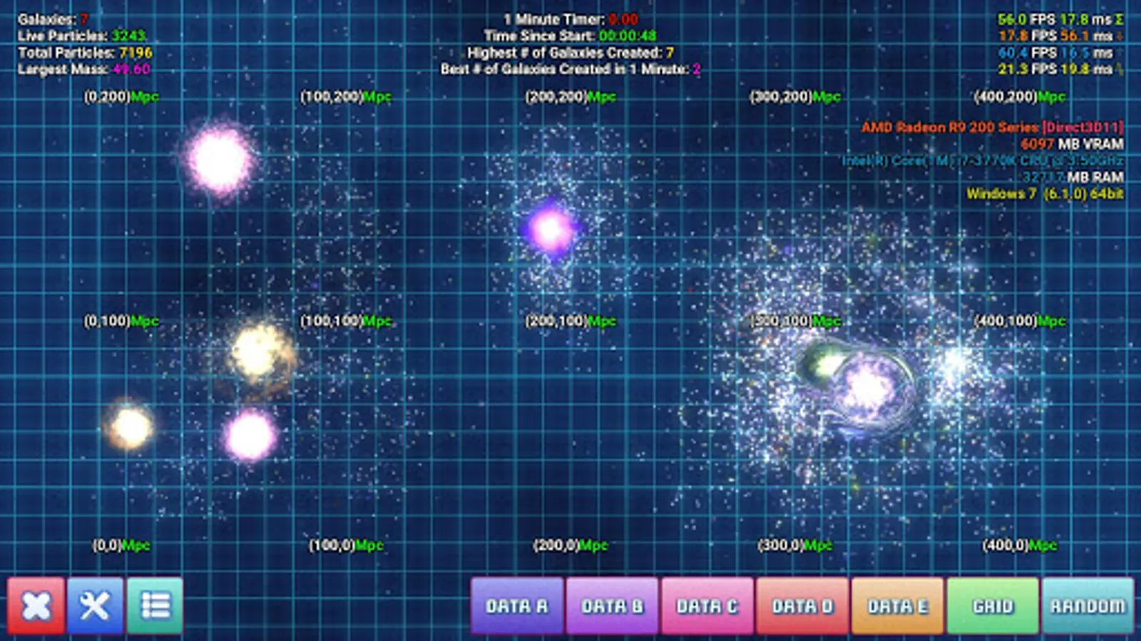 Galaxy Formation is a multi-platform educational app depicting how dark matter particles in the universe clump together over billions of years to form things like stars, planets and galaxies. The app does this with a lite, real-time simulation of thousands of n-body particles that are attracted by gravitational forces that form galaxies when combined.