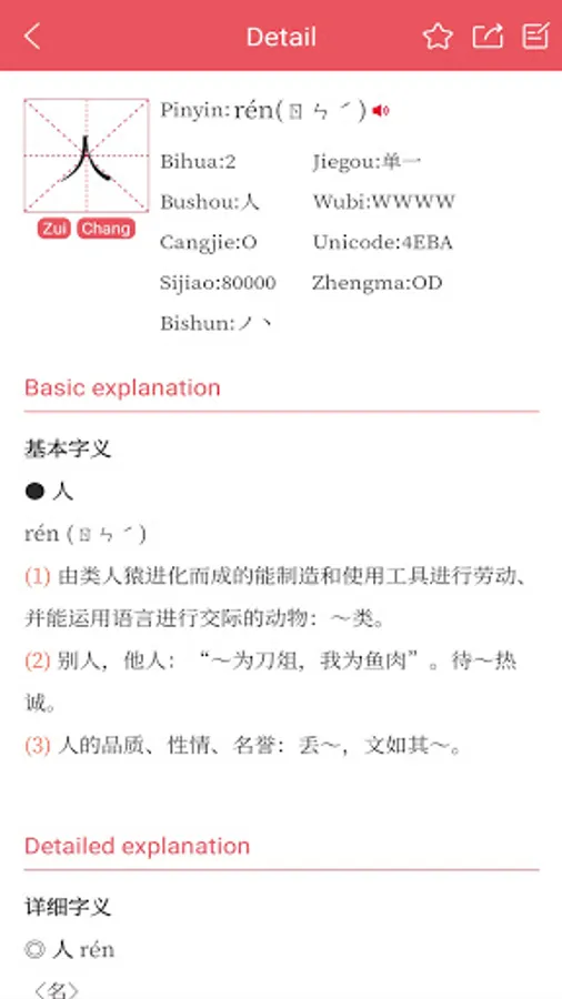4. Comprehensive attributes: including Pinyin, Zhuyin, radicals, strokes, structure, Wubi, Cangjie, Unicode, four-corner code, Zheng code, stroke order, etc.