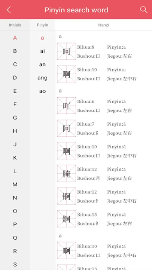 "Learn Chinese Dictionary" is a feature-rich and practical Chinese character query APP, suitable for all those who learn Chinese. The dictionary contains more than 30,000 Chinese characters, including modern Chinese common characters, commonly used characters, classical Chinese characters and rare characters.