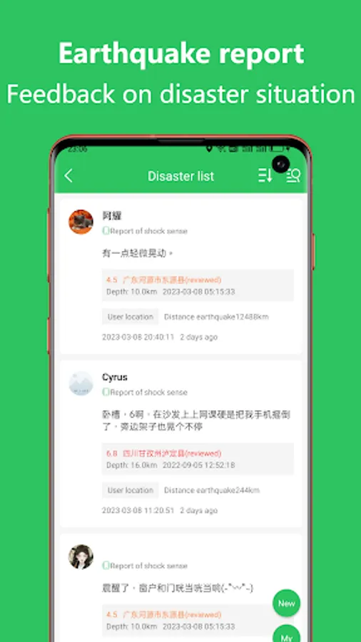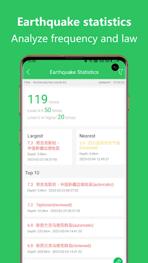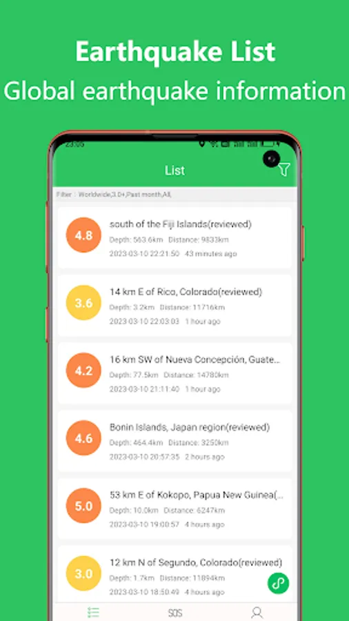 1. Real-time query: Display the latest earthquake information around the world in the form of lists and maps, and you can filter the earthquake scope, earthquake time and earthquake magnitude.