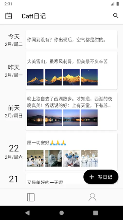 Catt's diary, the interface adopts design concepts such as minimalism and flatness, hoping to give users a comfortable experience. Focus on keeping a journal and falling in love with memories. All content is independently developed by the author.