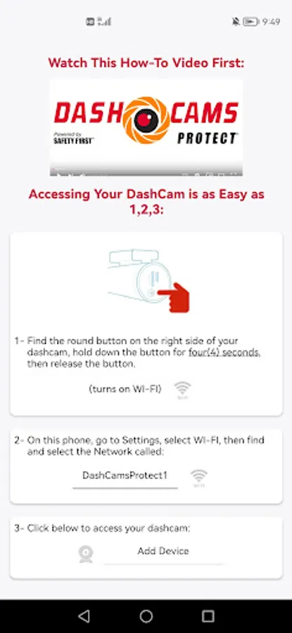 DashCamsProtect is the optional phone App for wireless communication with DASH CAMS PROTECT brand dashcams, and allows the user to view live streaming video, download videos for sharing, and adjust settings.