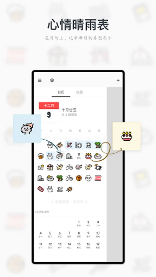 ※ Daily mood: record the mood of the day on the calendar to generate a unique mood barometer.