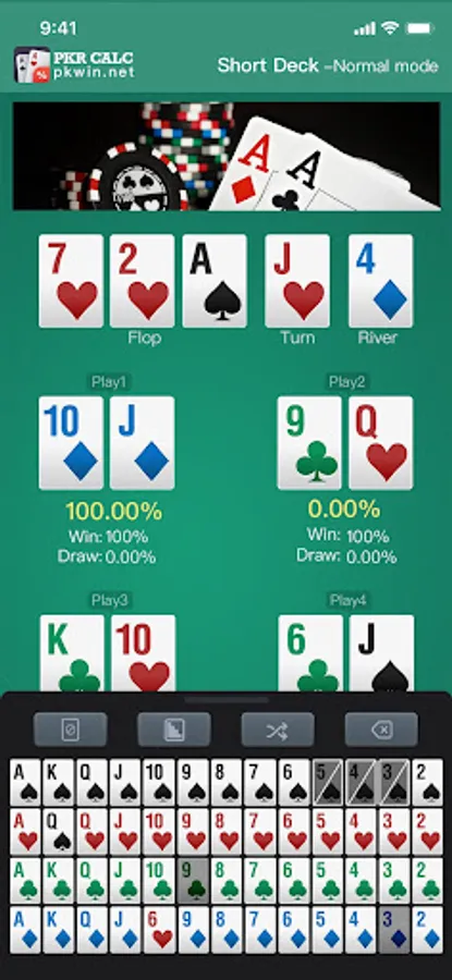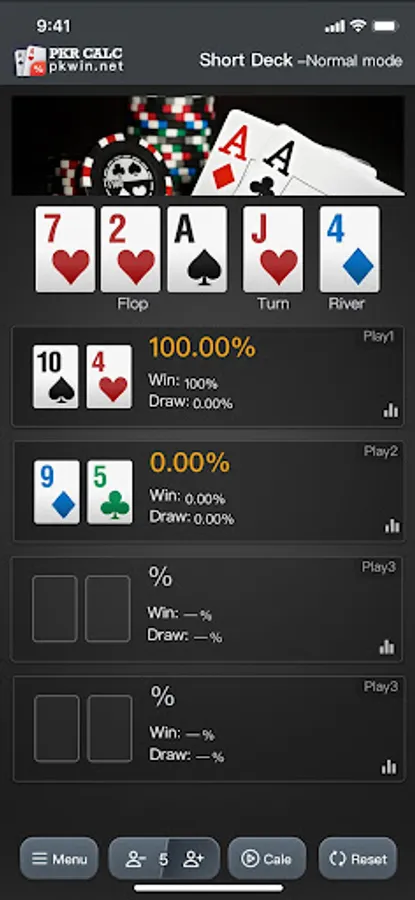 PKR Calc is a poker odds calculator that computes equities for matchups in Hold’em, Short Deck (6+), and 5+.