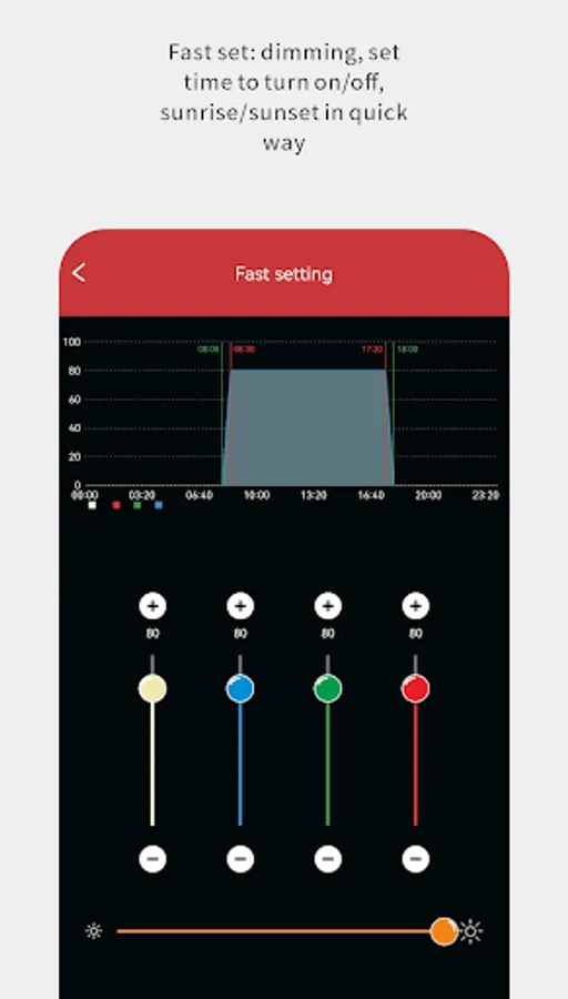 - Fast setting: to set dimming, time to turn on/off, sunrise and sunset in a very quick and easy way.