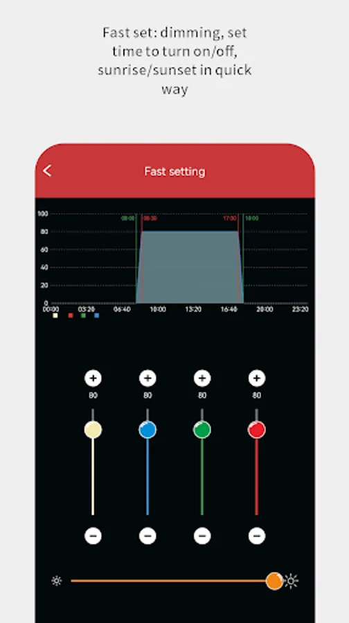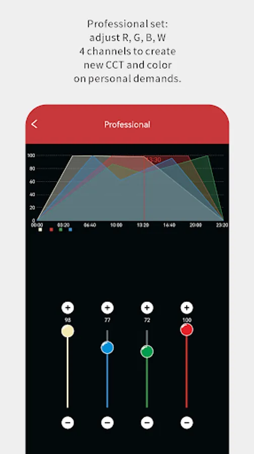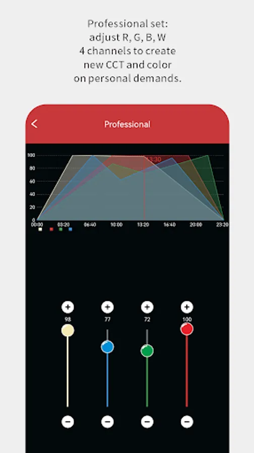 - Professional setting: besides dimming, timing, the R, G, B and W 4 channels can be adjusted separately to create new CCT and color as consumer's require, totally 48 setting points in 24 hours.
