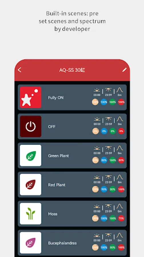- Pre built-in scenes: developers pre build some frequently use scenes in app: green plant, red plant, moss, bucephalandraz, swamp. Consumer can use these scenes by just one click.