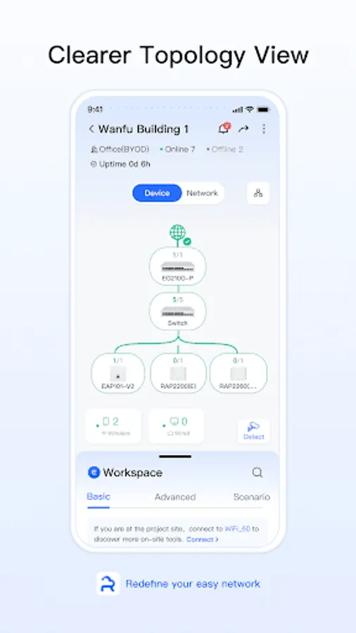 Ruijie Cloud is a powerful tool that allows you to quickly deploy your wireless network in only 1 minute by scanning the QR code on devices. You can easily add devices, set WiFi and monitor the network status, topology and alarm.
