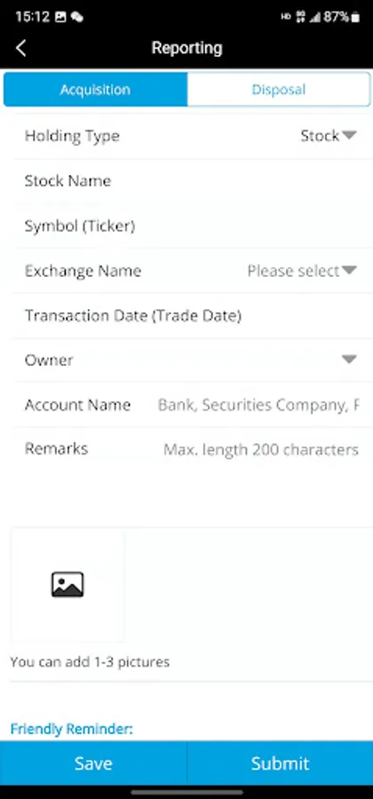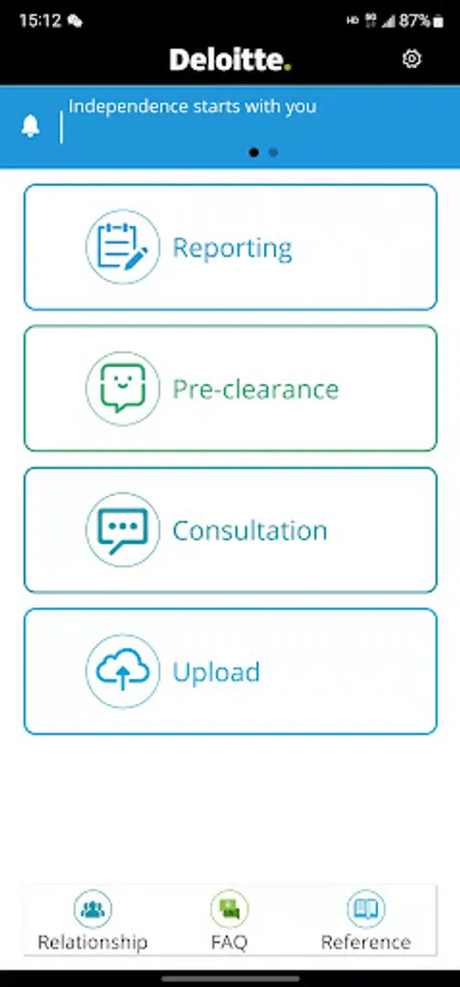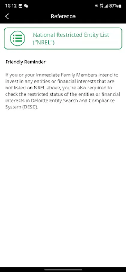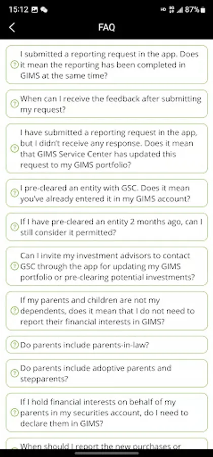 This mobile application is developed to facilitate the process of reporting / pre-clearance / consultation regarding personal financial interests for the employees and their families. It is another channel for them to submit Service Center (GSC) with information which have been collected by GSC functional mailbox currently. It's expected that users can report their financial interests or consult with GSC whenever and wherever they want through the app.
