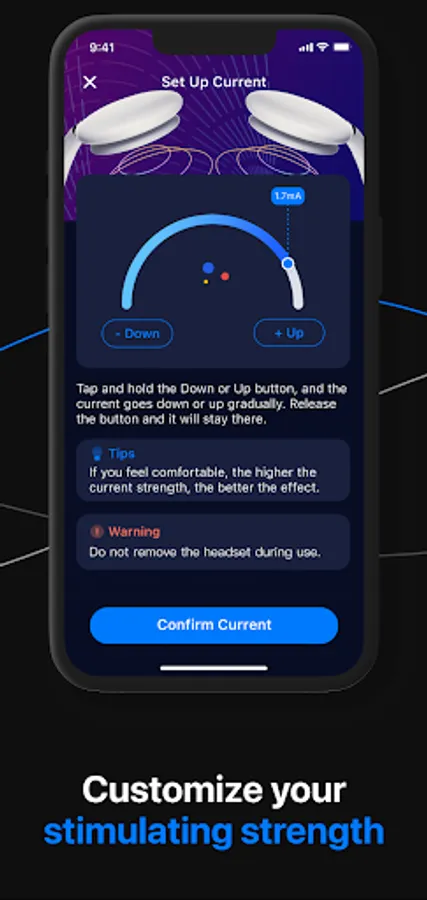 Just tap the + button to increase the current little by little till you reach 2mA at most. After setup, there is no need to open the app every time you start the stimulation unless you want to improve by increasing the current strength.
