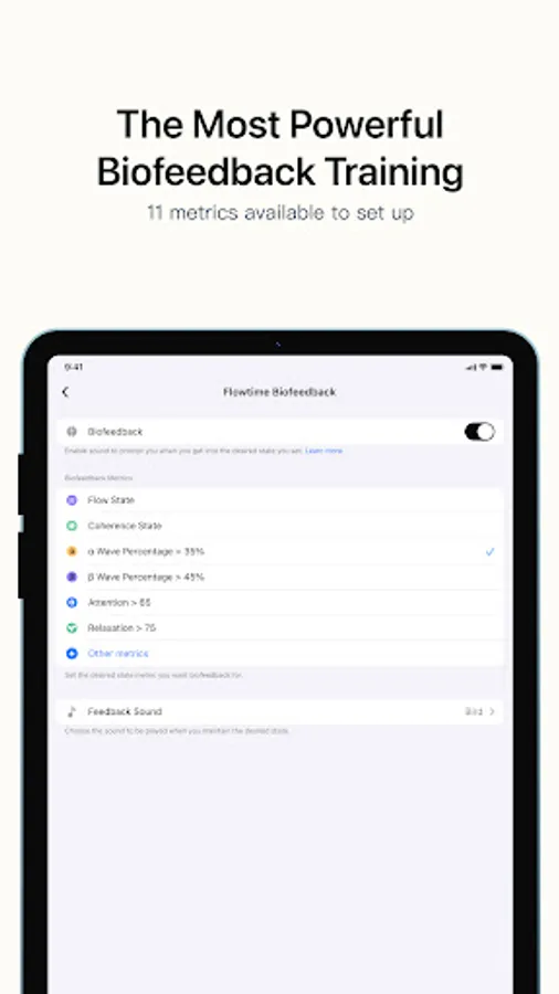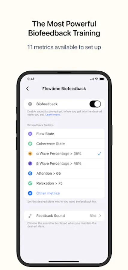 Know you're getting there as you hear the sound that verifies your desired state, whether it's flow, breath coherence, alpha or theta status, or focused concentration. No more guesswork or relying solely on feelings. There are 11 metrics available to set up.