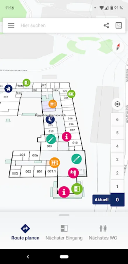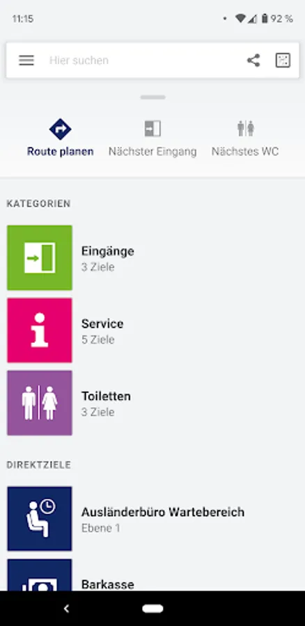 - Ziel suchen: Finden Sie ein Ziel (z.B. WC, Infoschalter) direkt über die digitale Karte, das Verzeichnis oder die Freitext-Suche.
