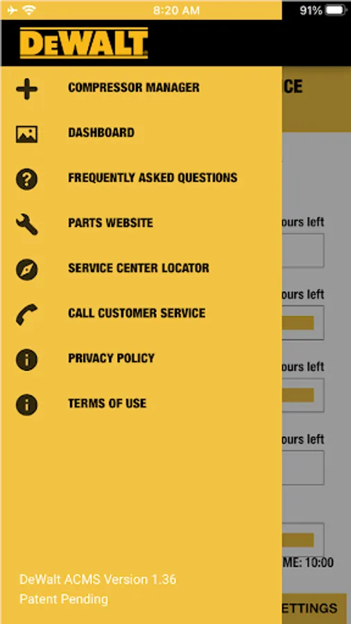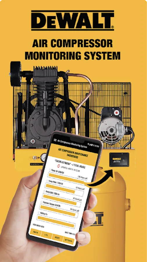 -Simply choose your specific DEWALT air compressor model number within the app, and pair the app with the monitoring device mounted on your air compressor, to begin recording run time.