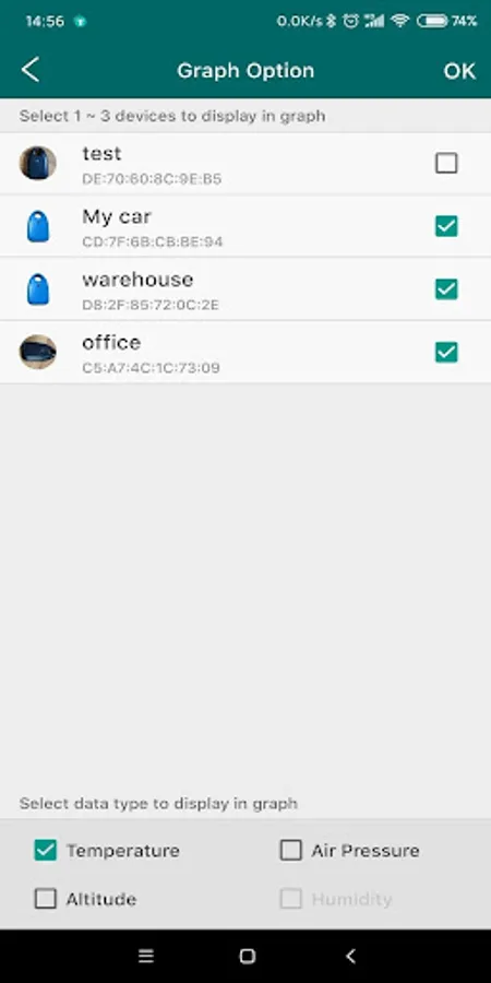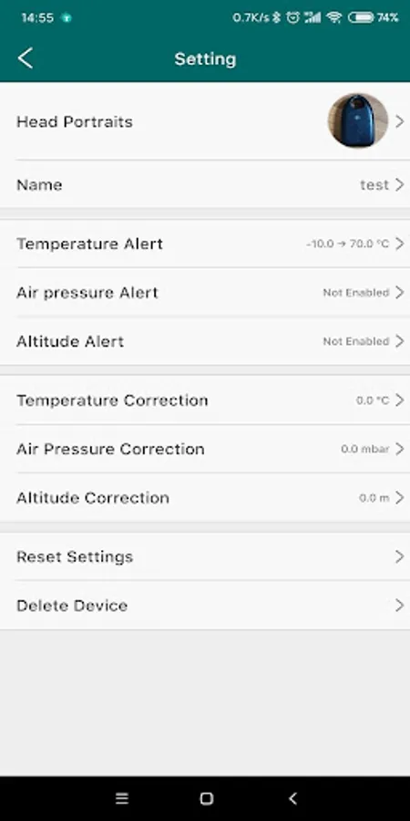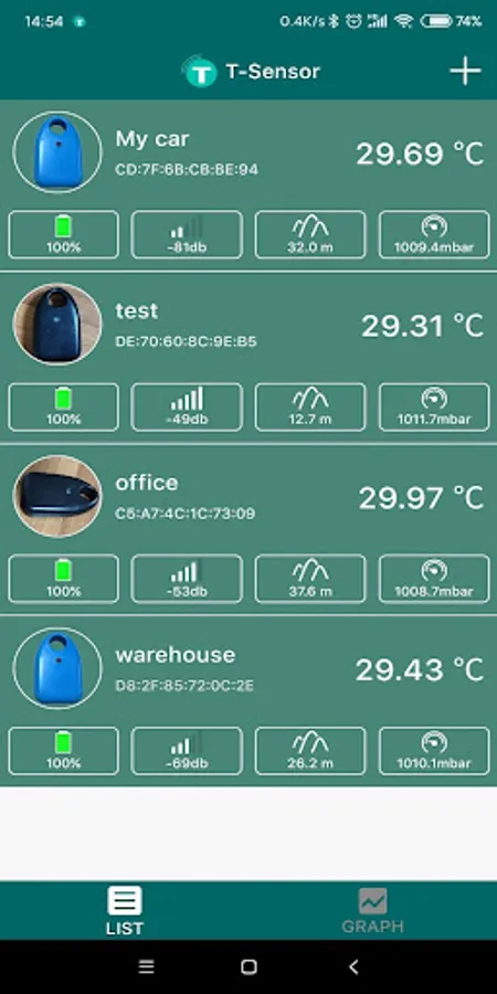 Display nearby T-Sensor values, such as Temperature, Humidity, Air-Pressure, Altitude. The app will keep bluetooth connection with device all the time to get instant sensor data. You can change your device avatar by taking photo. Sensor data are store in app, you can export excel file to share with other devices.