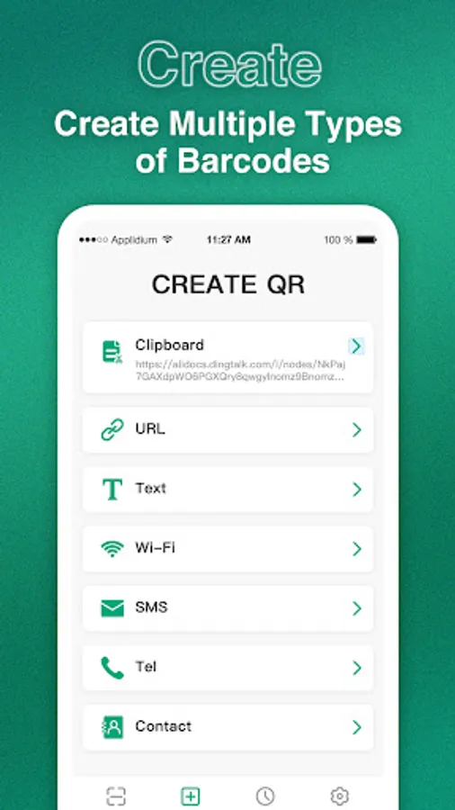 Create: contact information, email, activity, location, phone number, phone information, text, website, WiFi details.