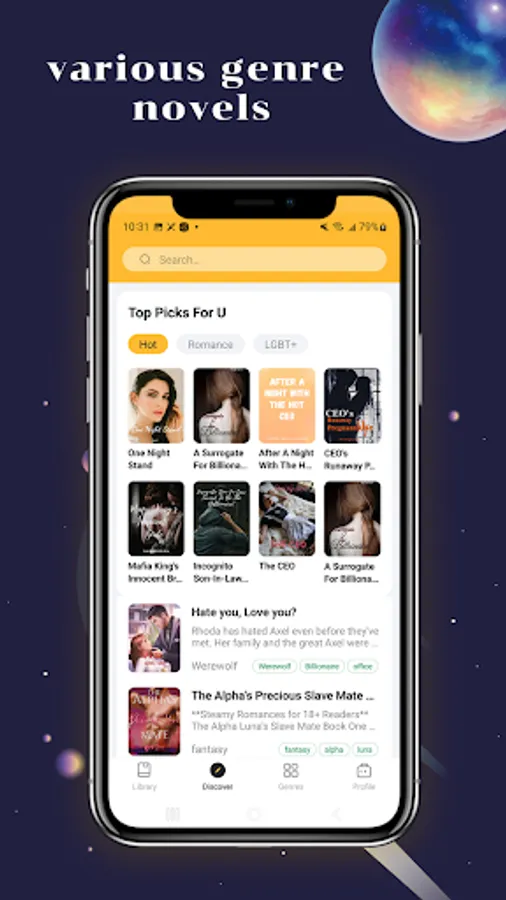 We have many types of stories: Romance, Mystery, Fantasy, Western, Sci-Fi, Fanfiction and more! And give you the best recommendation according to your preferences!