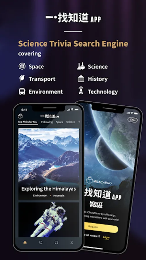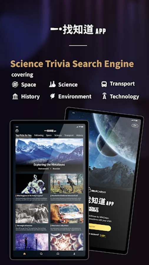 An APP that covers 6 major topics – from outer space to environmental science, from antiquity to the present – Astronomy, Science, Transportation, History, Environment and Tech.