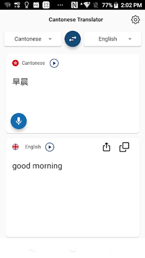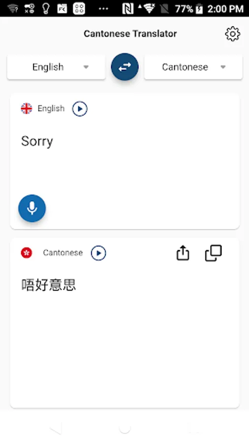 Translate Mandarin into Cantonese or Cantonese into Mandarin. Support voice reading. Convenient for daily learning and reading of Cantonese, as well as living and learning in Guangdong and Hong Kong.